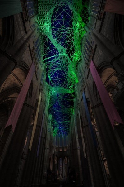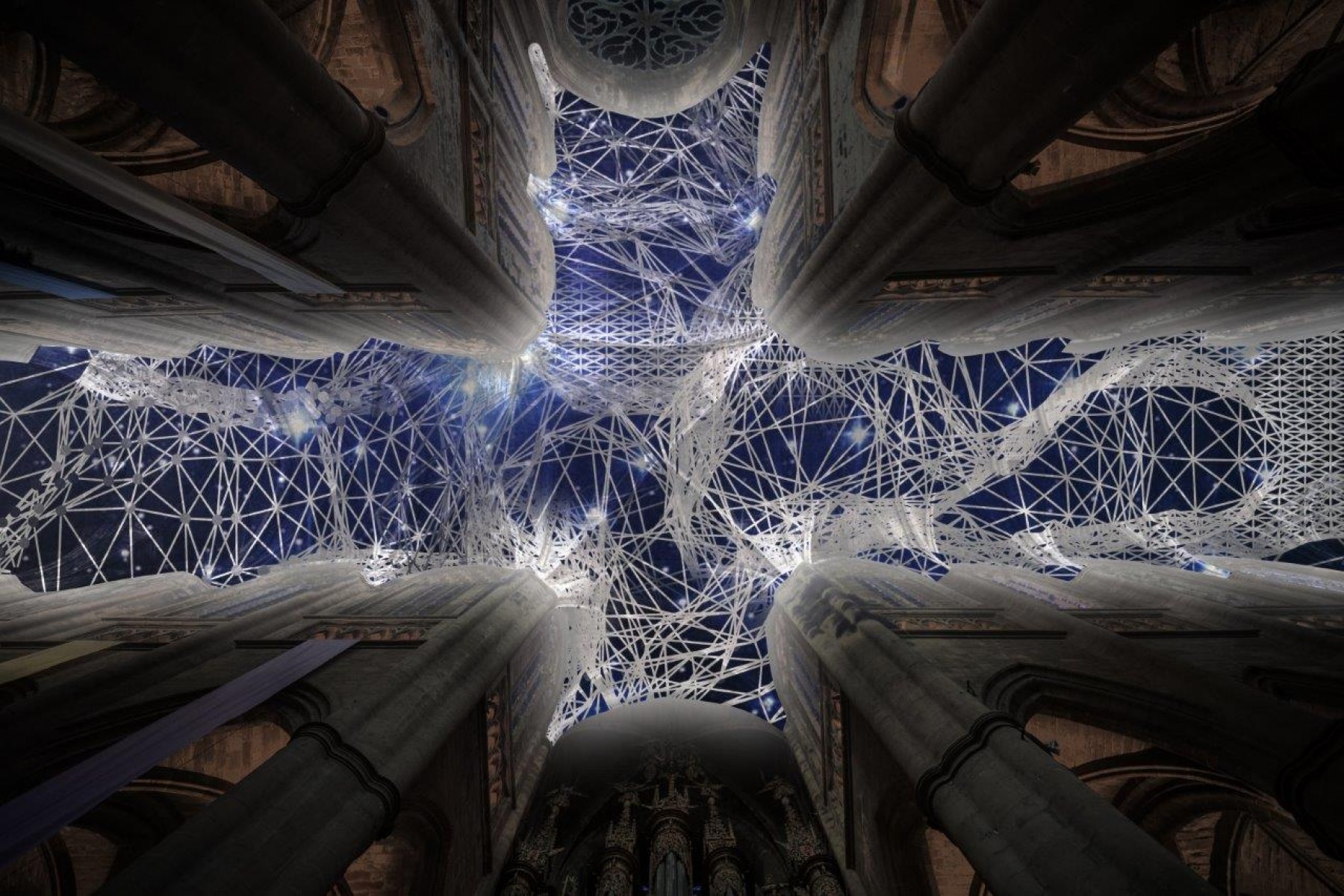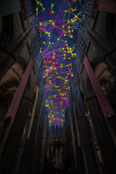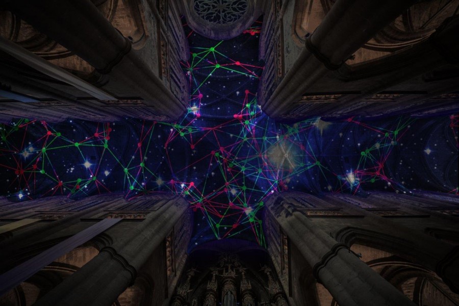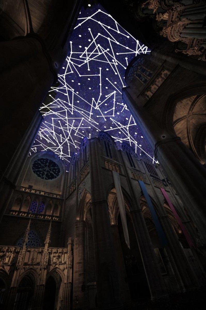Digital Supernova est une installation de réalité virtuelle générative projetée sur les voûtes de la nef, du transept, de la croisée du transept et du chœur de la cathédrale Notre-Dame de Rodez. 35 différentes trames de lumière colorées sous forme de réseaux sinueux se développent les unes après les autres, superposées à d’étonnantes cartes du ciel imaginaires et de supernovas, explosions lumineuses d’étoiles massives. Ces grands maillages se forment et se déforment, créant des univers diversifiés sans cesse renouvelés. Ce grand drapé virtuel de lumière se tord, se redimensionne pour créer des formes plus diversifiées et complexes. Les éléments s’attirent, se repoussent, créant un rythme de dilatation et de contraction semblable à la respiration. Les visiteurs sont invités à déambuler, s’assoir et lever les yeux vers les cieux. Ces constellations digitales de pixels immergent les visiteurs dans une atmosphère baignée de lumière. L’installation ouvrant sur l’infini, dégage une énergie rayonnante dans cet espace de plénitude. Elle plonge les visiteurs face aux mystères de l’univers. Lumière, couleur et mouvement créent une poétique de la matière et élaborent une nouvelle esthétique du virtuel.