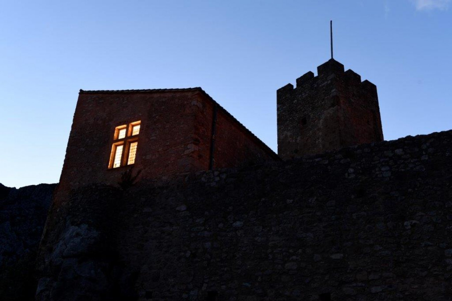 Conçue spécialement pour le château de Baulx, l’intervention de Delphine Renault est constituée de deux gestes : d’une part l’éclairage intérieur du logis du château donnant sur la route principale direction sud, d’autre part, la création d’une enseigne lumineuse installée sur le corps de logis représentant le Roc de Tras Castel (traduction : le rocher derrière le château), vue depuis le château.