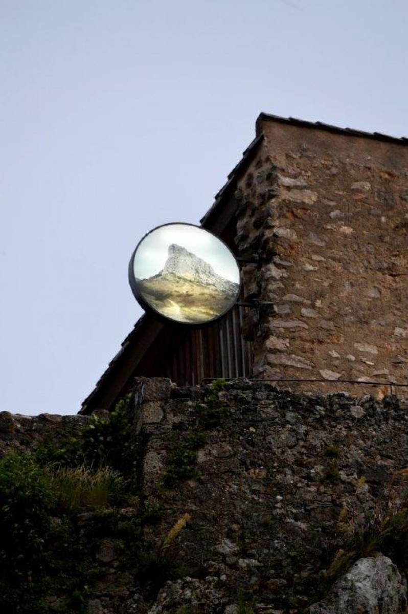 Venant du latin insignia, qui signifie « indice » pour désigner une activité ou une institution, le terme « enseigne » date du XIIe siècle et servait à distinguer les maisons les unes des autres pour reconnaître les rues qui n’avaient ni noms ni numéros. L’idée de déguiser le seul édifice d’habitation subsistant du château en hypothétique bâtiment utilisé, avec comme seuls indices un éclairage intérieur et une enseigne, donne une nouvelle perception de ce bâtiment, renouant le lien d’usage entre le village et son château.