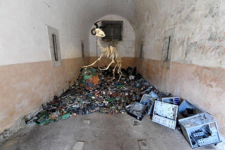 Dans la poudrière, le visiteur étonné découvre une espèce animale inconnue sous la forme d’un étrange squelette de chameau à quatre cornes trônant sur des monceaux de déchets informatiques. C’est le Camelus post-humanus. Il nous renvoie à la question de la préservation de la biodiversité que les artistes abordent avec humour mais non sans gravité. De manière aussi à rendre plus accessible le message de l’inquiétude écologique face à la sixième grande extinction annoncée.