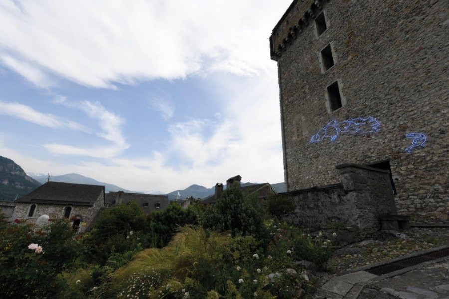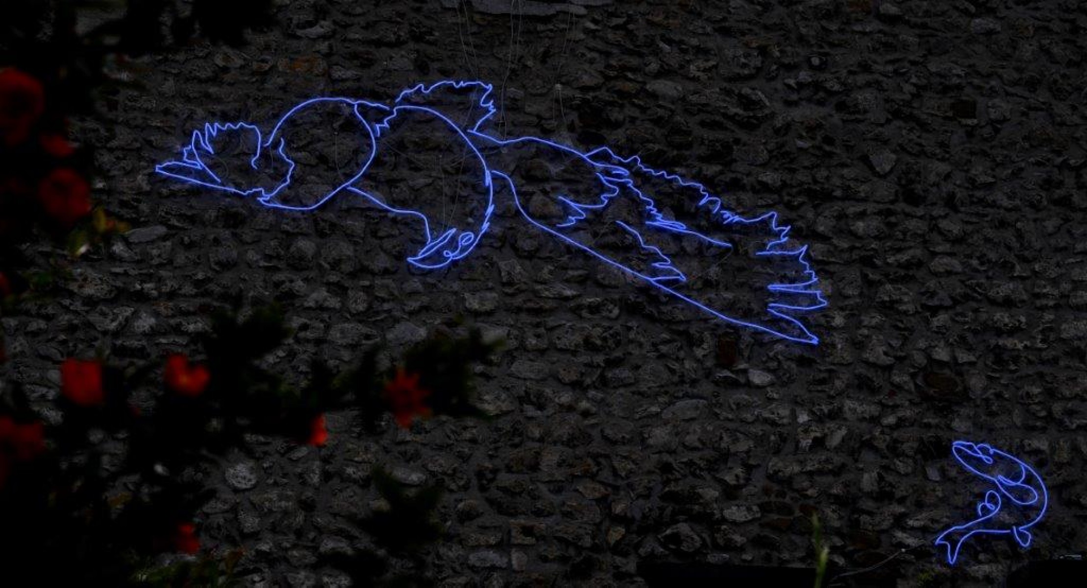 La seconde proposition se situe en extérieur sur les murailles du donjon qui surplombe la ville et les sanctuaires ou a été placée une œuvre de néon au dessin d’oiseau. Il s’agit d’un aigle, comme celui du blason de la ville associé à une truite qui selon la légende a sauvé la cité assiégée. Cette œuvre qui assure une permanence de la lumière peut également faire penser à la tradition des cires filée (ou bougies de deuil), présentée dans le musée.