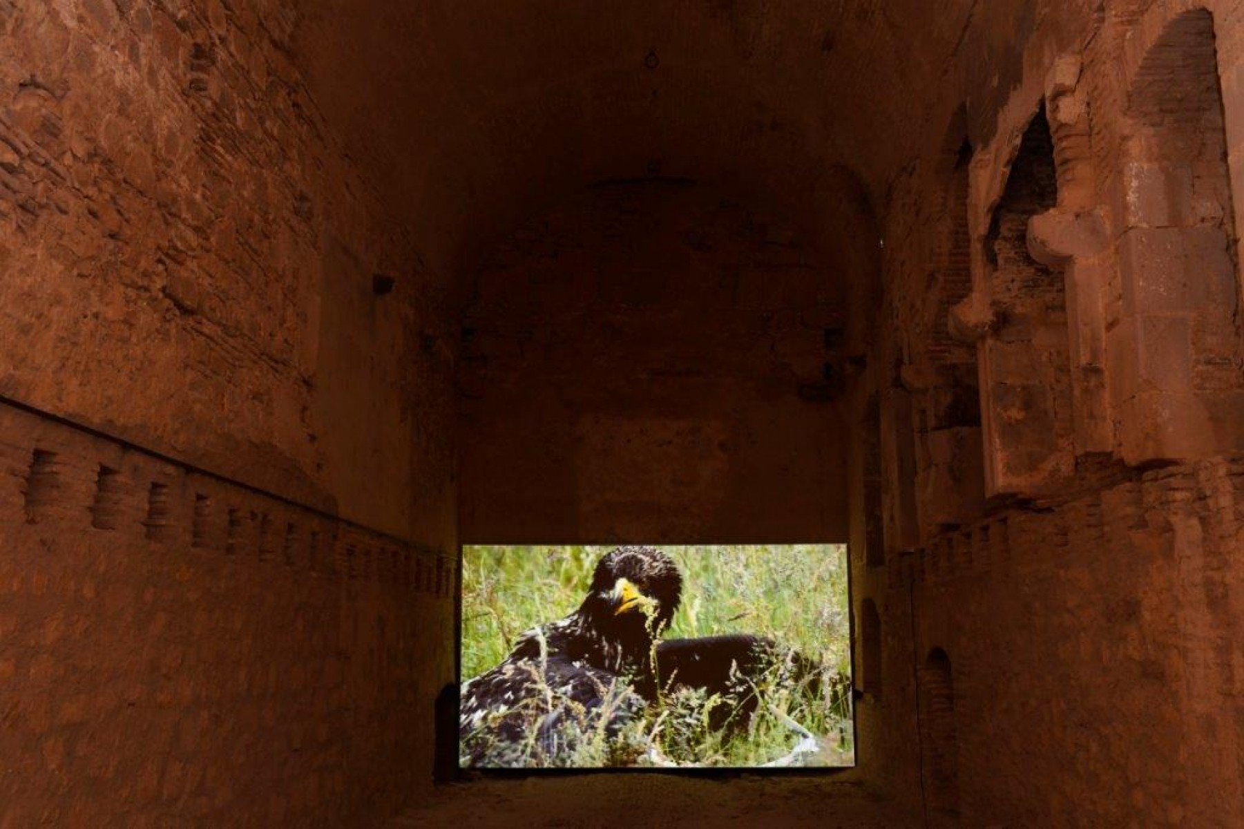 Mircea Cantor confronte la violence animale à l’ingérence humaine dans l’espace naturel, l’ingérence sous toutes ses formes, qu’elle s’exprime politiquement ou technologiquement. Proposée dans la forteresse de Salses, la vidéo soulève autant la question de la défense du territoire que celle de l’interaction de l’animal avec l’homme dans un lien de subordination ancestral et complexe.