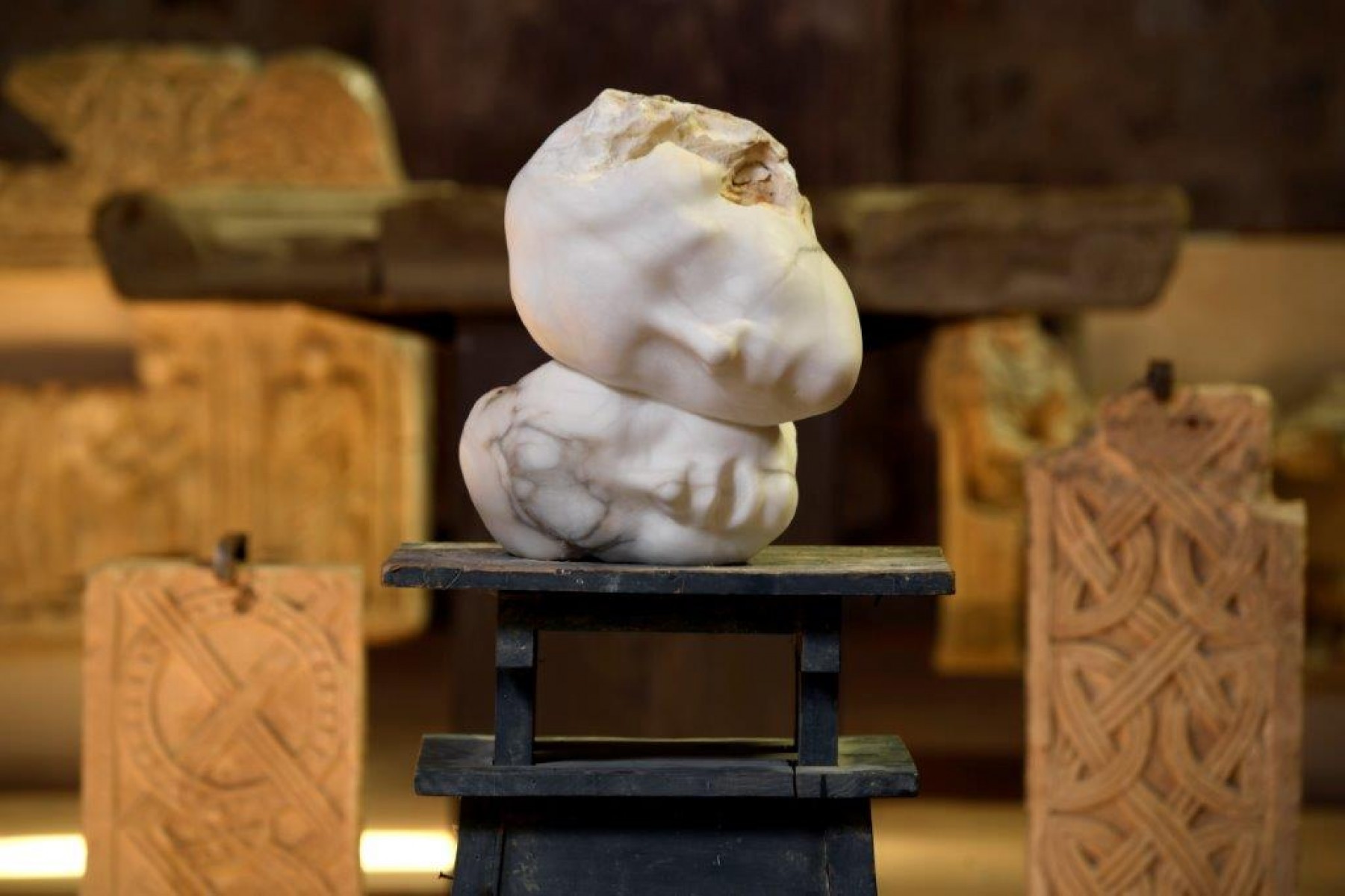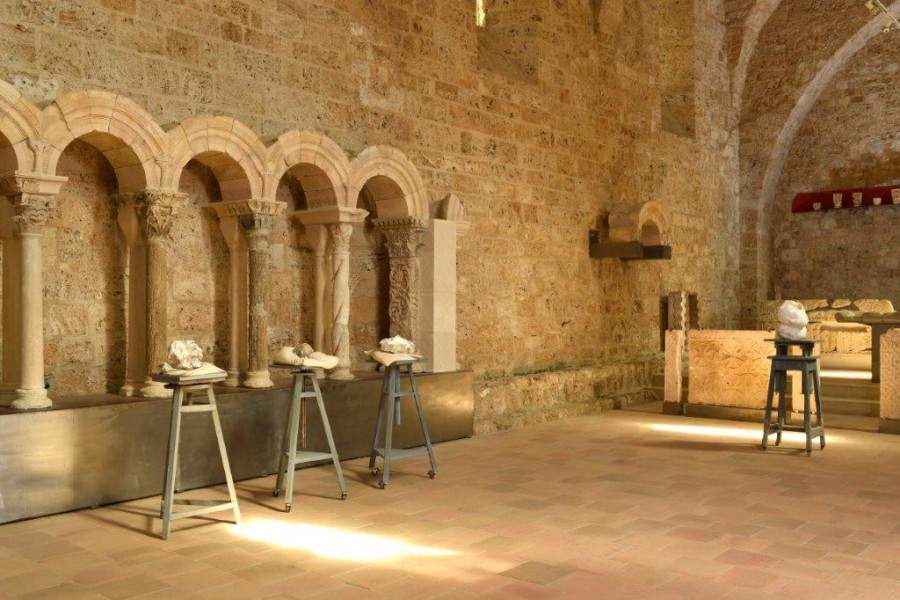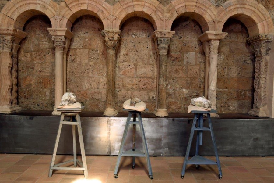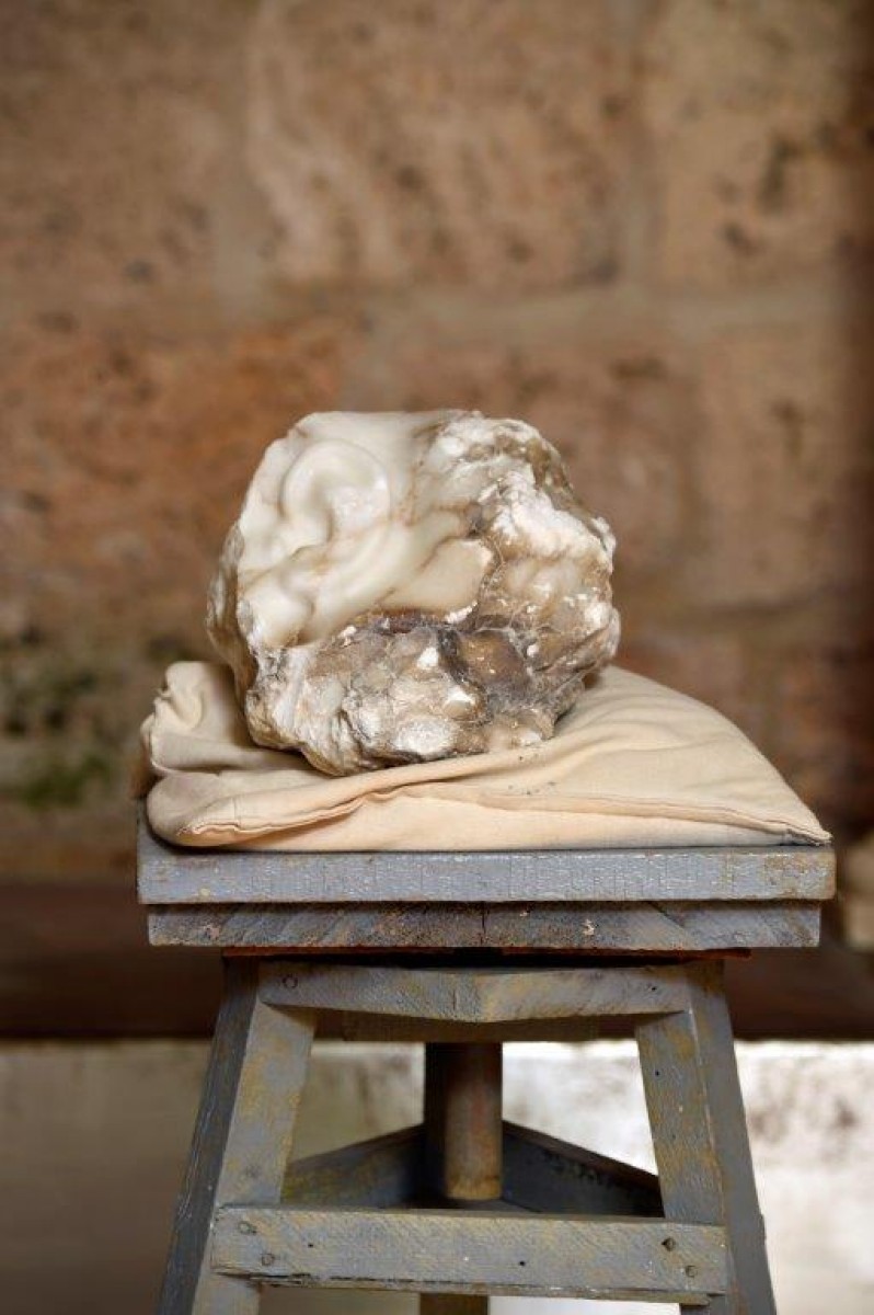 Dans le musée Lapidaire de l’abbaye de Gellone, Sofie Muller présente un ensemble de sculptures en albâtre. Une sculpture composée de deux visages, celui d’une femme, d’une mère, et celui d’un enfant, posés l’un sur l’autre, et un ensemble de fragments de corps. La première sculpture incarne la relation mère/enfant, à la fois aimante et fusionnelle, la pierre liant structurellement les deux êtres. La relation est complexe et ambiguë, composée d’amour et parfois de souffrance, ce que suggère aussi le poids de la pierre sur le visage de l’enfant. Sofie Muller privilégie l’albâtre pour sa fragilité, ses irrégularités, comme des éléments propres à la vie. Rédigée au VIe siècle par Benoît de Nursie, la Règle de saint Benoît est toujours en vigueur dans les abbayes bénédictines et cisterciennes. Bien qu’elle n’y figure pas exactement en ces termes, on en retient aujourd’hui la formule « Ora et labora (prie et travaille) ». Inspirée par la Règle de saint Benoît, Sofie Muller présente dans le musée Lapidaire une seconde composition, faite de trois sculptures en albâtre, permettant d’en visualiser les principales prescriptions, à savoir lutter contre l’oisiveté par la lecture divine et le travail manuel. Les fragments du corps – une oreille, une bouche, une main – surgissent des blocs de pierre comme une manifestation du vivant.
